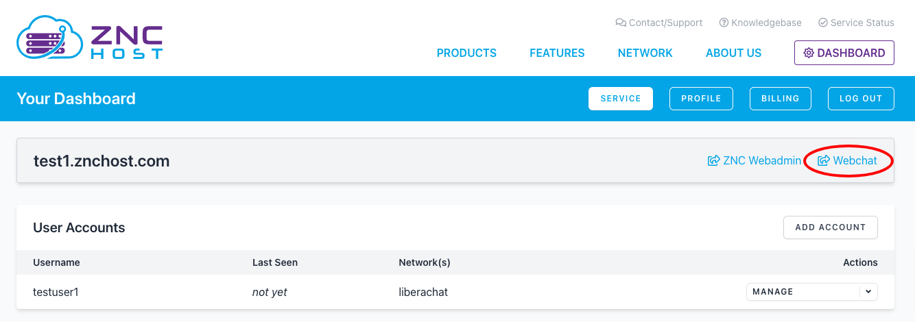 Alternatively (or if you don't remember your ZNCHost instance URL), you can go through our dashboard and click the "Webchat" link: